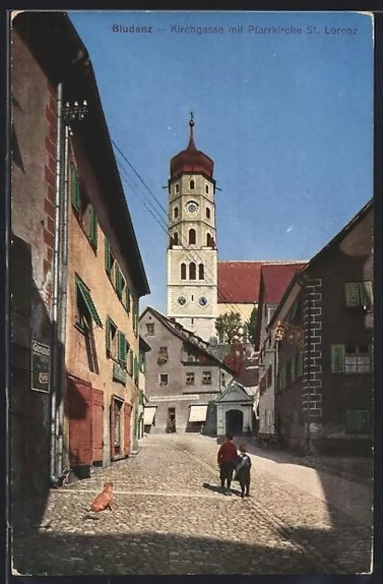 AK Bludenz, Strassenpartie der Kirchgasse mit Pfarrkirche St. Lorenz