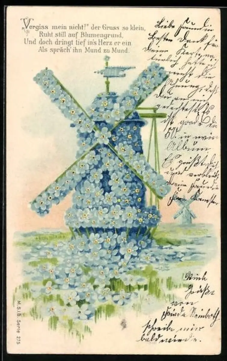 AK Blumenbild, Windmühlen verziert mit Vergissmeinnicht