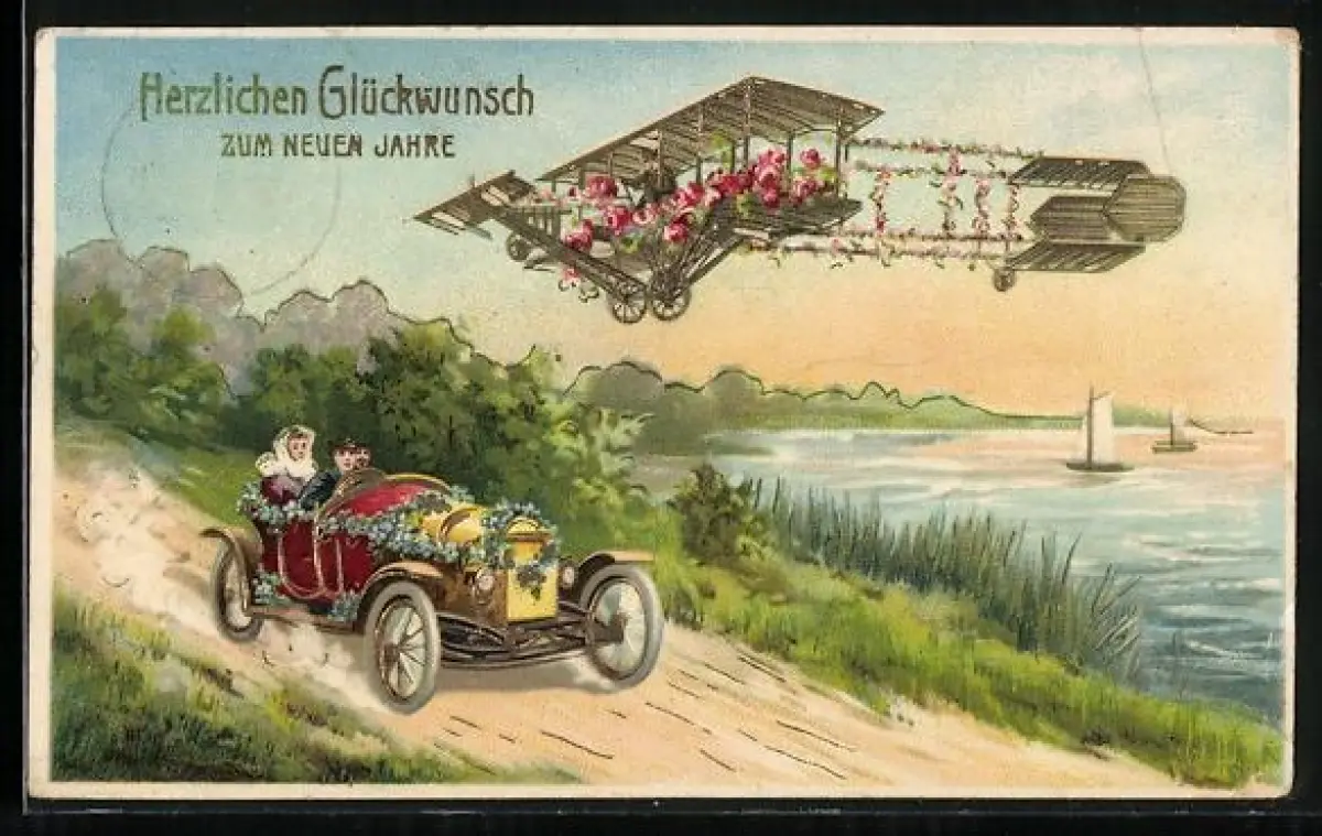 AK Blumengeschmücktes Flugzeug fliegt über ein fahrendes Auto, Neujahrsgruss