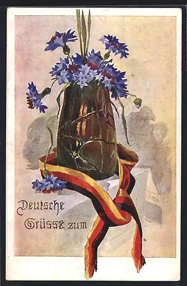 AK Blumenvase mit schwarz-rot-goldener Schleife, Deutsche Grüsse..., Bund der Deutschen in Nieder-Österreich