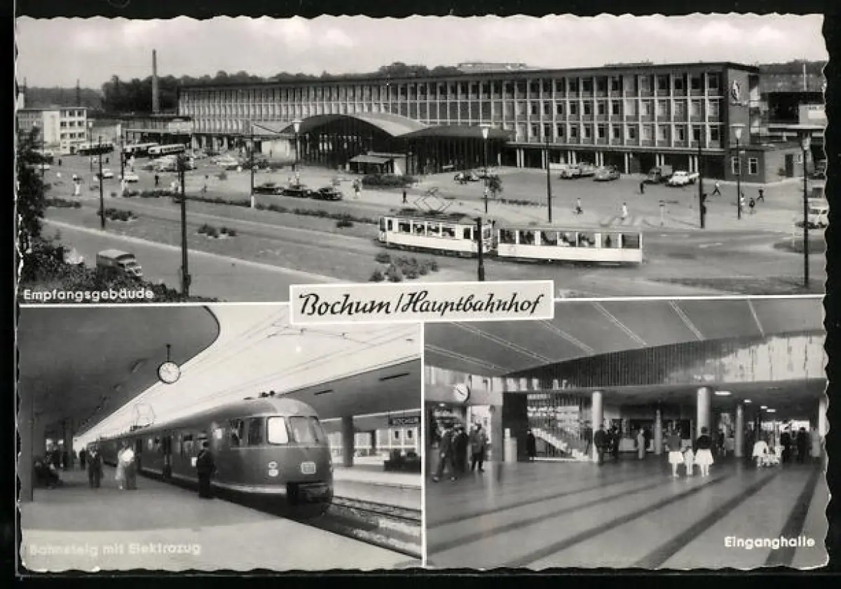AK Bochum, Hauptbahnhof, Gebäude mit Strassenbahn, Bahnsteig mit Elektrozug, Eingangshalle