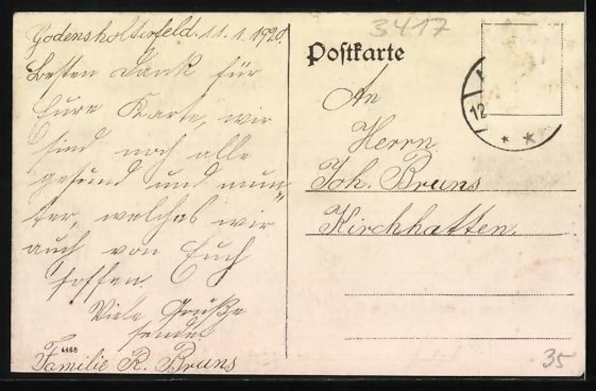 alte Ansichtskarte, gelaufen, Briefmarke entfernt, rückseitig Oberflächenschaden, guter Zustand