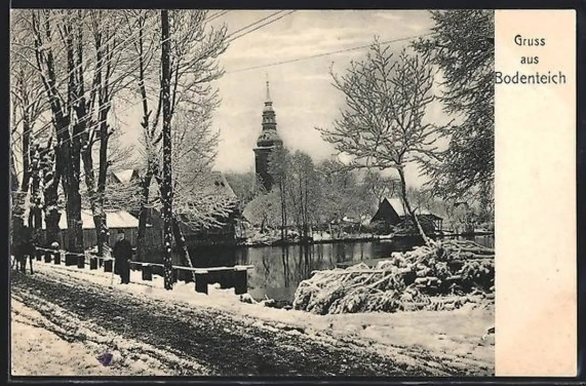 AK Bodenteich, Strassenpartie mit Kirchblick im Winter