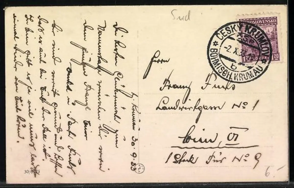 gelaufen 1933, Eckknick rechts oben, guter Zustand