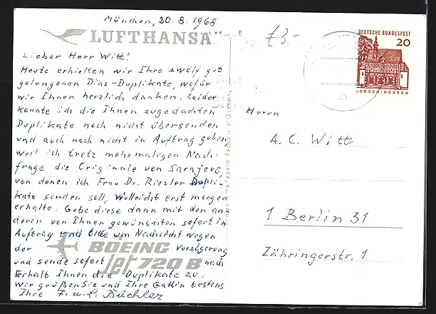 AK Boeing Jet 720B der Lufthansa über den Wolken