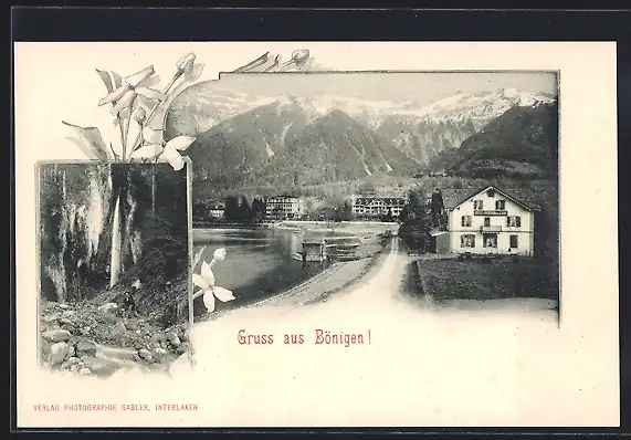 AK Bönigen, Strassenpartie am Ortseingang, Wanderer in der Klamm