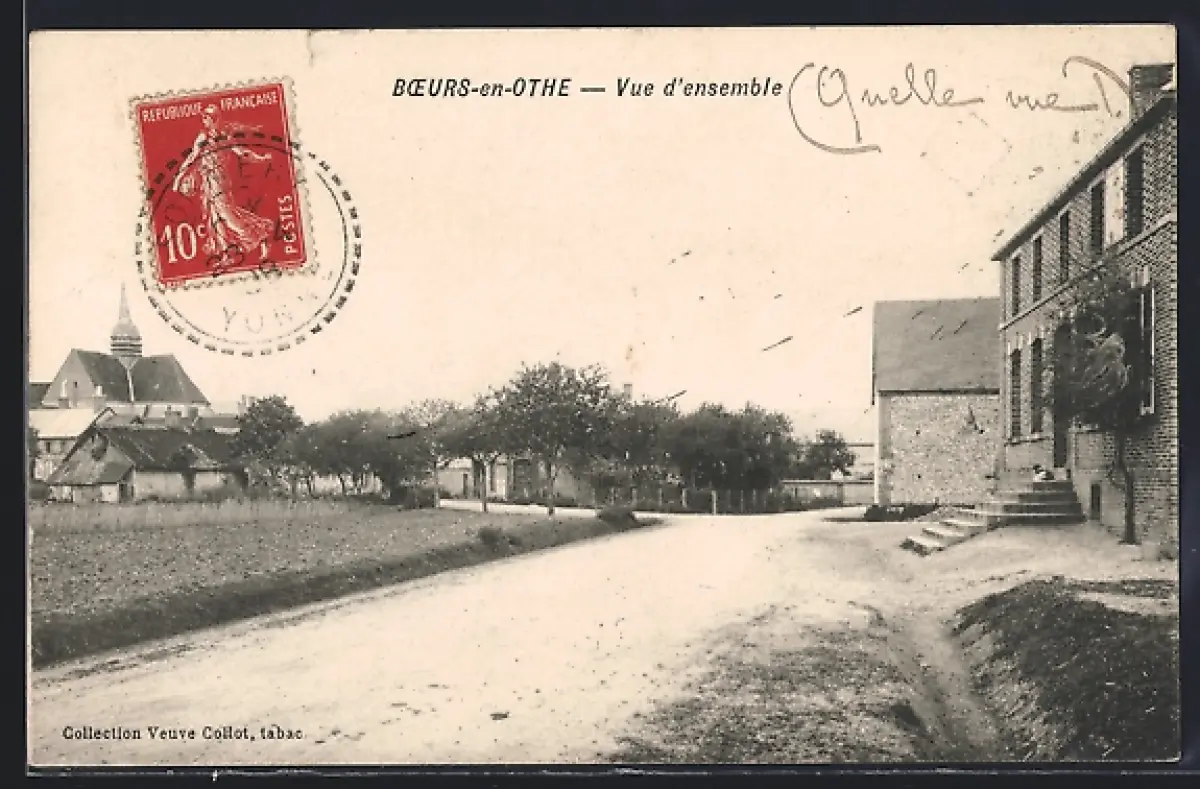 AK Boeurs-en-Othe, Vue d`ensemble de la rue principale avec bâtiments en briques et église au fond