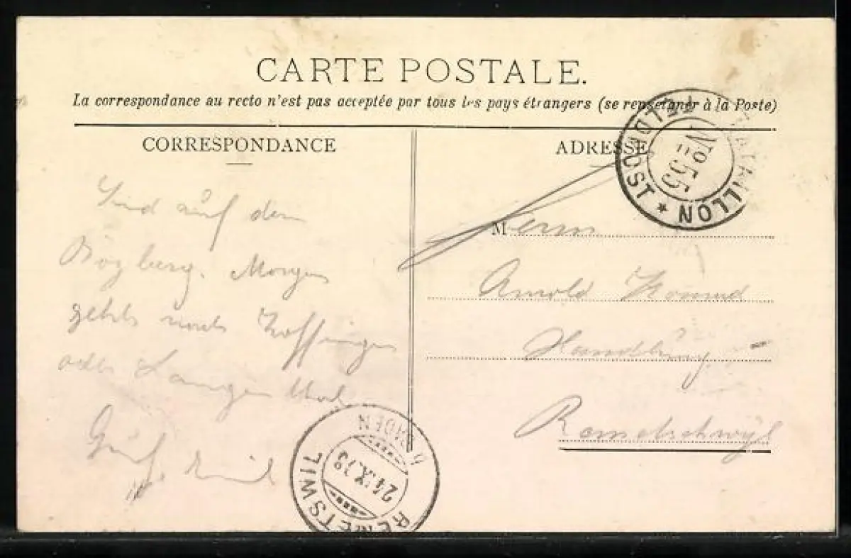 Personenbezogene Daten auf der Rückseite der Karte wurden durch blauen Textmarker unkenntlich gemacht. Die blauen Stellen sind auf die Vorderseite durchgeweicht und wirken sich negativ auf das Postkartenfoto aus