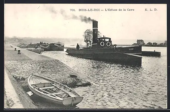 AK Bois-le-Roi, L`Écluse de la Cave avec un bateau à vapeur