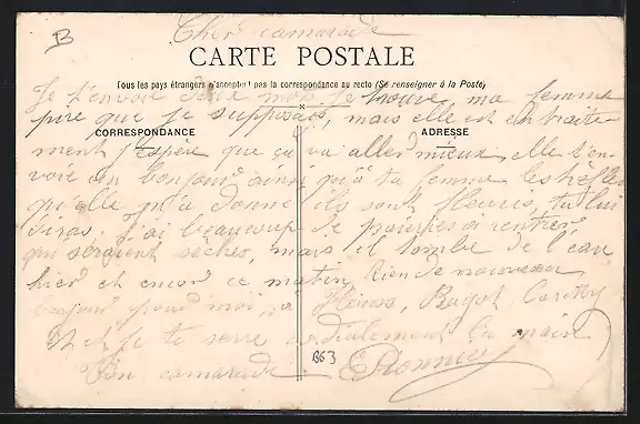 Personenbezogene Daten auf der Rückseite der Karte wurden durch blauen Textmarker unkenntlich gemacht. Die blauen Stellen sind auf die Vorderseite durchgeweicht und wirken sich negativ auf das Postkartenfoto aus