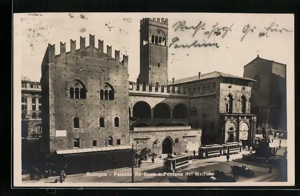AK Bologna, Palazzo Re Enzo e Fontana del Nettuno mit Strassenbahn