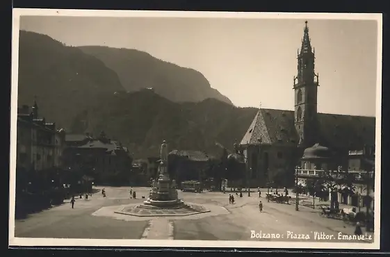 AK Bolzano, Strassenbahn in Fahrt vor der Kirche, Piazza Vittor. Emanuele