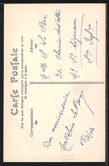 Personenbezogene Daten auf der Rückseite der Karte wurden durch blauen Textmarker unkenntlich gemacht. Die blauen Stellen sind auf die Vorderseite durchgeweicht und wirken sich negativ auf das Postkartenfoto aus