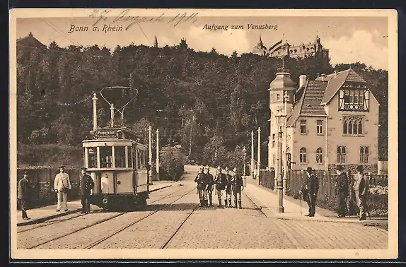 AK Bonn /Rh., Aufgang zum Venusberg, mit Strassenbahn nach Poppelsdorf, Schaffnern und Soldatengruppe
