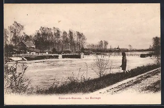 AK Bonnard-Bassou, Le Barrage et vue d`un promeneur au bord de l`eau