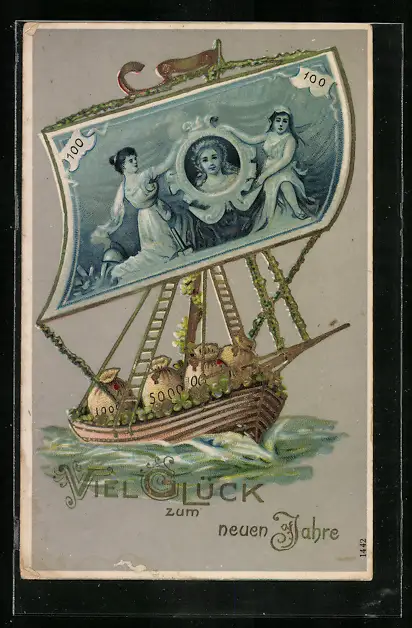 AK Boot mit Geldschein als Segel in Fahrt, Neujahrsgruss