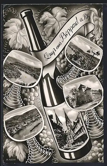 AK Boppard a. Rh., Alte Burg, Sesselbahn und Severuskirche im Weinflaschen-Passepartout