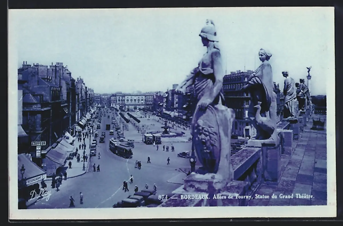 AK Bordeaux, Alllées de Fourney, Statue du Grand Théâtre, Strassenbahn