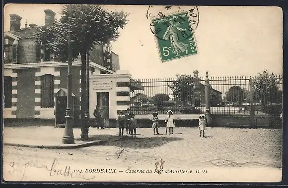 AK Bordeaux, Caserne du Régiment d`Artillerie avec enfants devant l`entrée