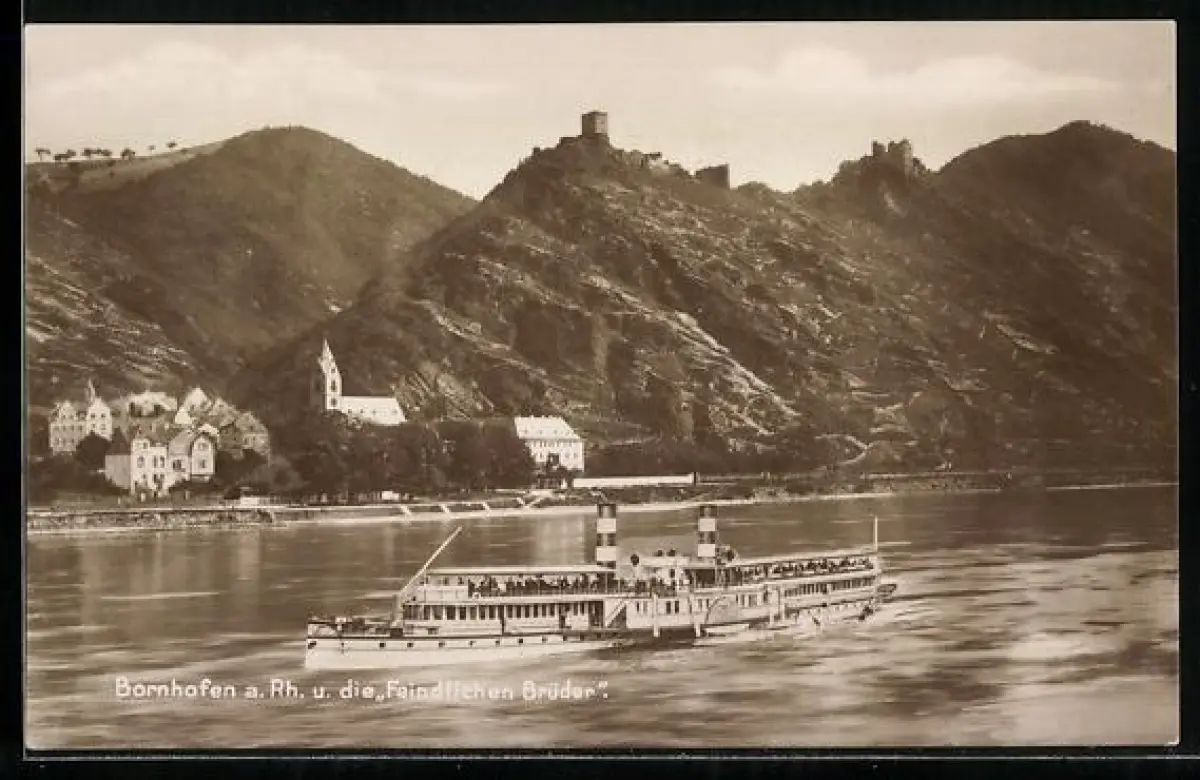 AK Bornhofen a. Rh., Passagierschiff Borussia und Burgen Die Feindlichen Brüder