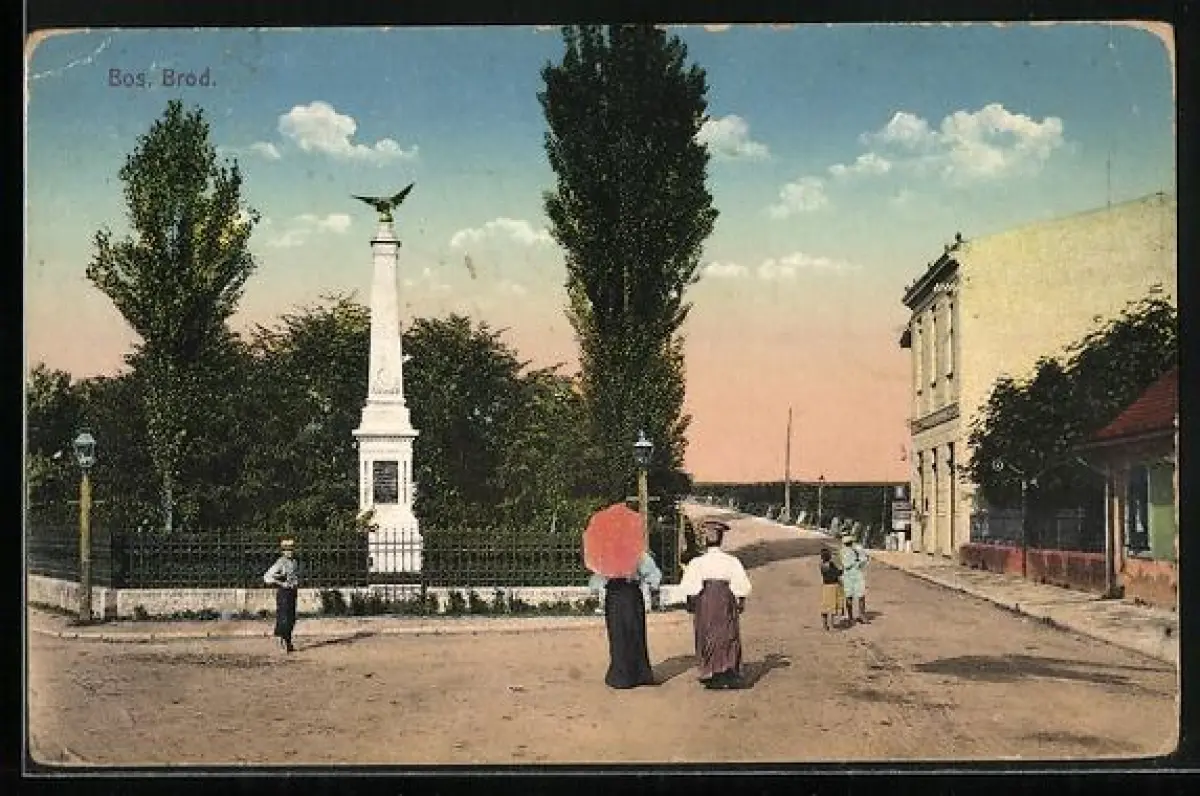 AK Bos. Brod, Strassenpartie mit Denkmal