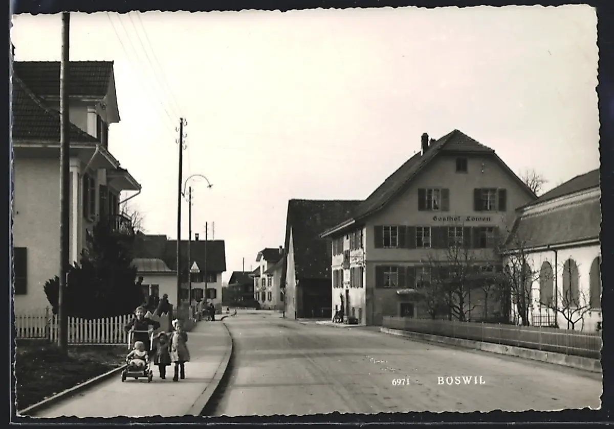 AK Boswil, Strassenpartie mit Gasthof Löwen und Kindern