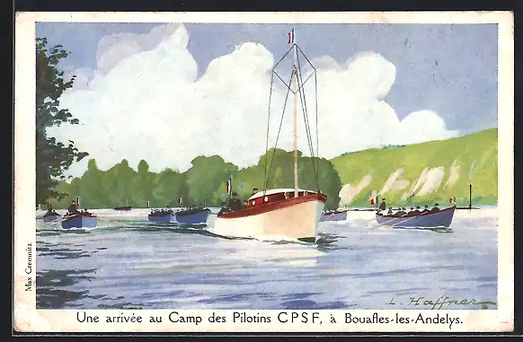 AK Bouafles-les-Andelys, arrivée au Camp des Pilotes CPSF en bateau