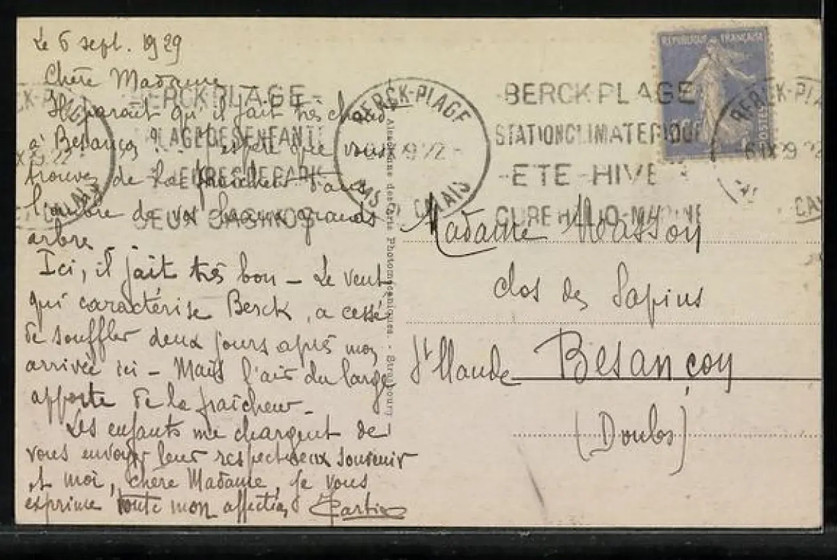 Personenbezogene Daten auf der Rückseite der Karte wurden durch blauen Textmarker unkenntlich gemacht. Die blauen Stellen sind auf die Vorderseite durchgeweicht und wirken sich negativ auf das Postkartenfoto aus