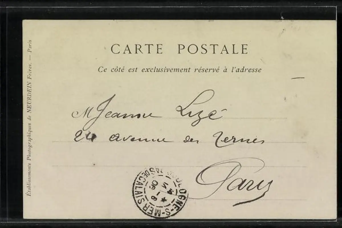 Personenbezogene Daten auf der Rückseite der Karte wurden durch blauen Textmarker unkenntlich gemacht. Die blauen Stellen sind auf die Vorderseite durchgeweicht und wirken sich negativ auf das Postkartenfoto aus