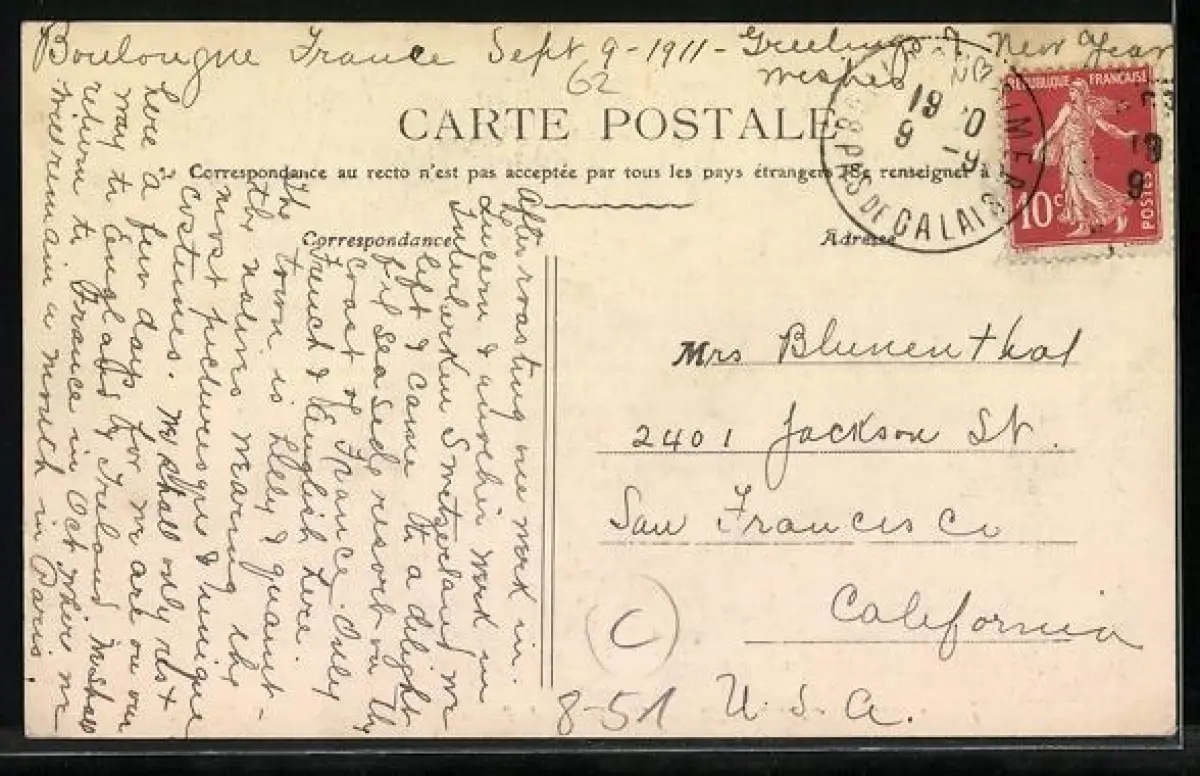 Personenbezogene Daten auf der Rückseite der Karte wurden durch blauen Textmarker unkenntlich gemacht. Die blauen Stellen sind auf die Vorderseite durchgeweicht und wirken sich negativ auf das Postkartenfoto aus