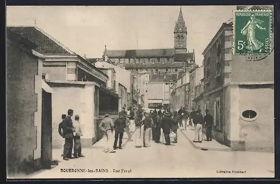 AK Bourbonne-les-Bains, Rue Féral avec des passants et vue sur l`église