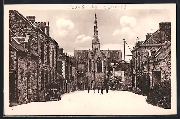 AK Bourg-des-Comptes, Vue de l`église et de la rue principale avec habitants et voiture