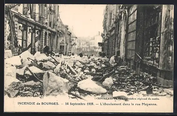 AK Bourges, Incendie 14 Septembre 1928, L`éboulement dans la rue Moyenne, zerstörte Häuser n. d. Brand