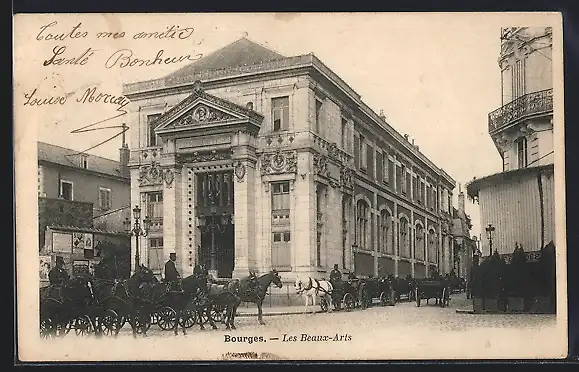 AK Bourges, Les Beaux-Arts avec chevaux et calèches devant le bâtiment