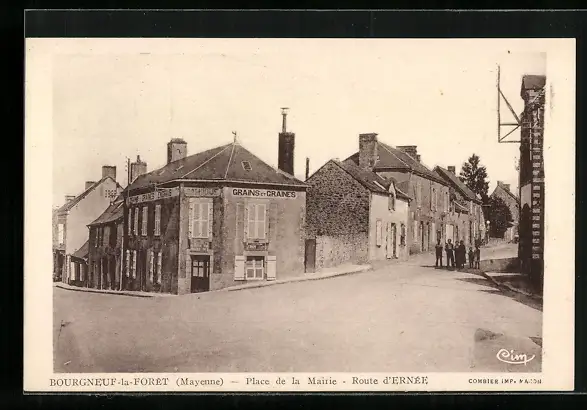 AK Bourgneuf-la-Forêt, Place de la Mairie, Route d`Ernée
