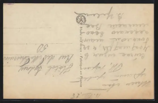 Personenbezogene Daten auf der Rückseite der Karte wurden durch blauen Textmarker unkenntlich gemacht. Die blauen Stellen sind auf die Vorderseite durchgeweicht und wirken sich negativ auf das Postkartenfoto aus