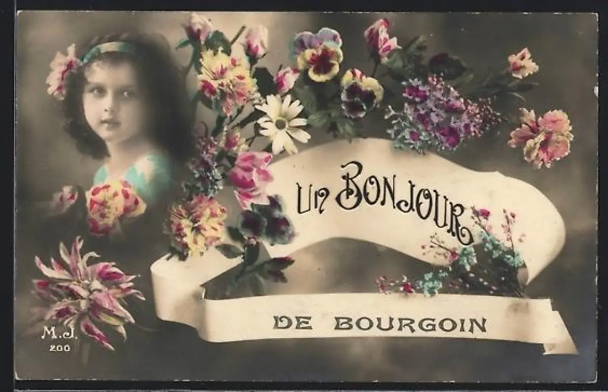 AK Bourgoin, Un bonjour fleuri avec portrait d`enfant