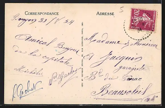 Personenbezogene Daten auf der Rückseite der Karte wurden durch blauen Textmarker unkenntlich gemacht. Die blauen Stellen sind auf die Vorderseite durchgeweicht und wirken sich negativ auf das Postkartenfoto aus