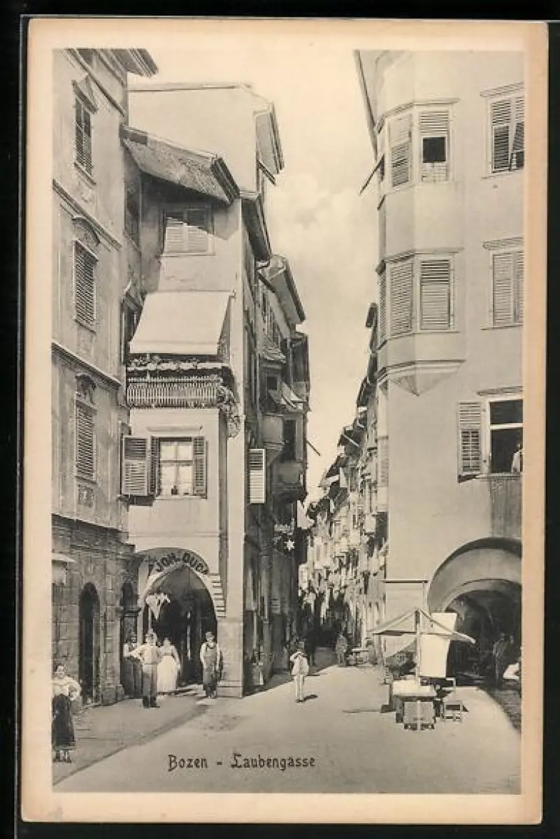 AK Bozen, Laubengasse mit Marktstand und Geschäften