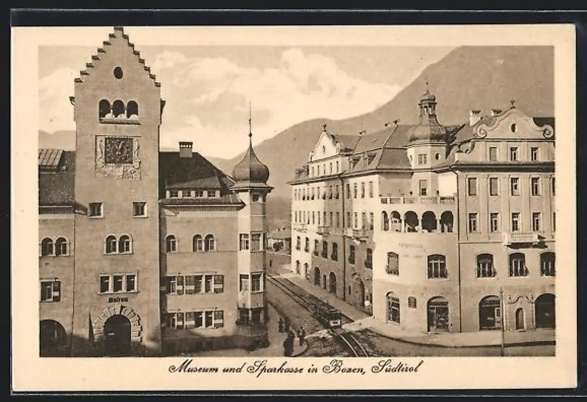 AK Bozen, Museum, Sparkasse und Strassenbahn