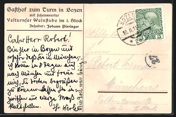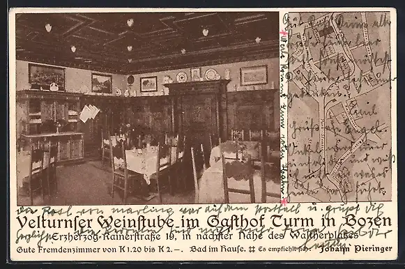 AK Bozen, Velturnser Weinstube im Gasthof Turm, Erzherzog-Rainerstrasse 19, Innenansicht, Stadtplan mit Bahnhof