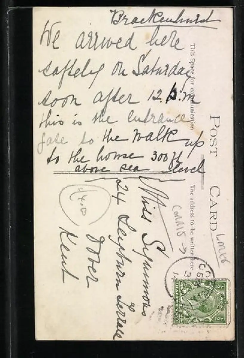 Personenbezogene Daten auf der Rückseite der Karte wurden durch blauen Textmarker unkenntlich gemacht. Die blauen Stellen sind auf die Vorderseite durchgeweicht und wirken sich negativ auf das Postkartenfoto aus