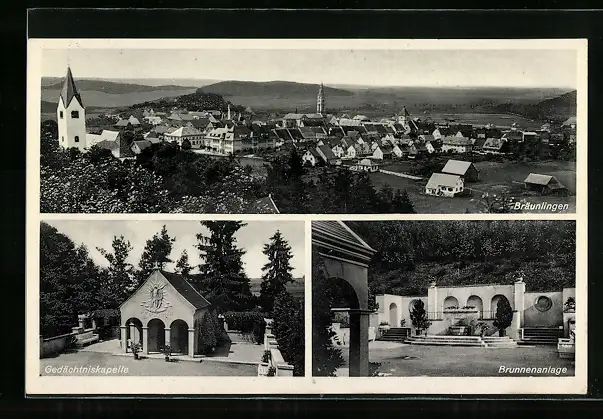 AK Bräunlingen, Teilansicht mit Kirche, Gedächtniskapelle, Brunnenanlage