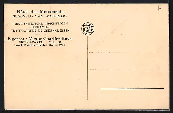 AK Braine l`Alleud, Hôtel des Monuments, Champ de Bataille de Waterloo, Propr. Victor Charlier-Bovri