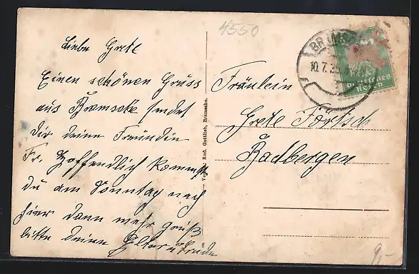 alte Ansichtskarte, gelaufen 1925, Briefmarke entfernt, Eckknicke li., Abriebspuren oben, Einriss unten mittig, guter Zustand