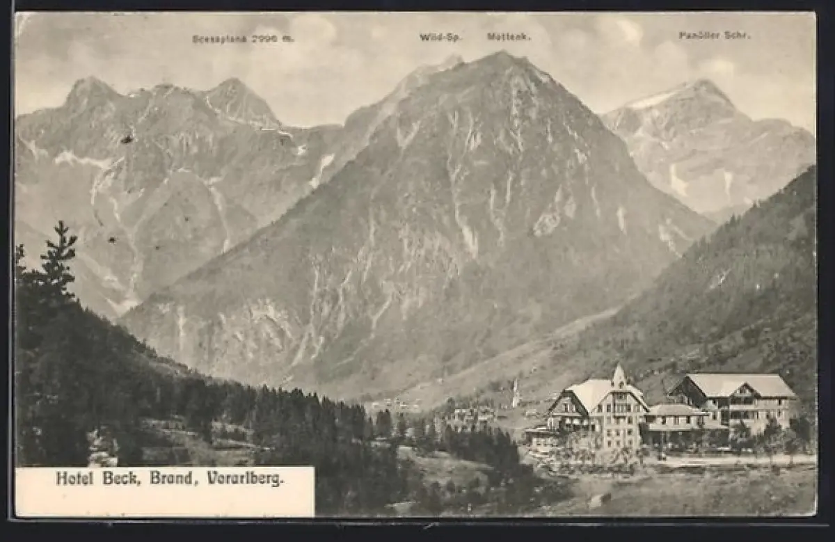 AK Brand /Vorarlberg, Hotel Beck mit Gebirgspanorama