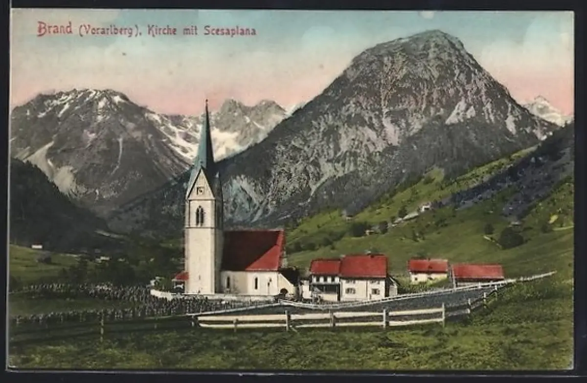 AK Brand /Vorarlberg, Kirche mit Scesaplana