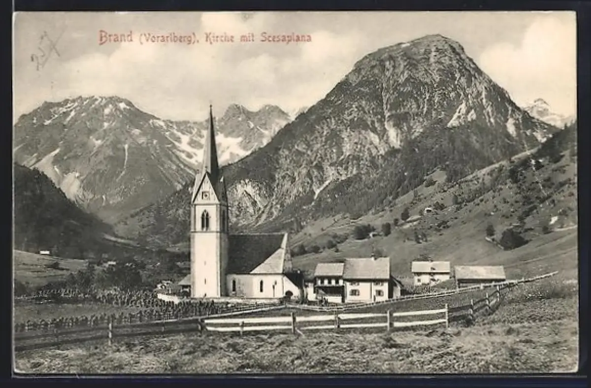 AK Brand /Vorarlberg, Kirche mit Scesaplana