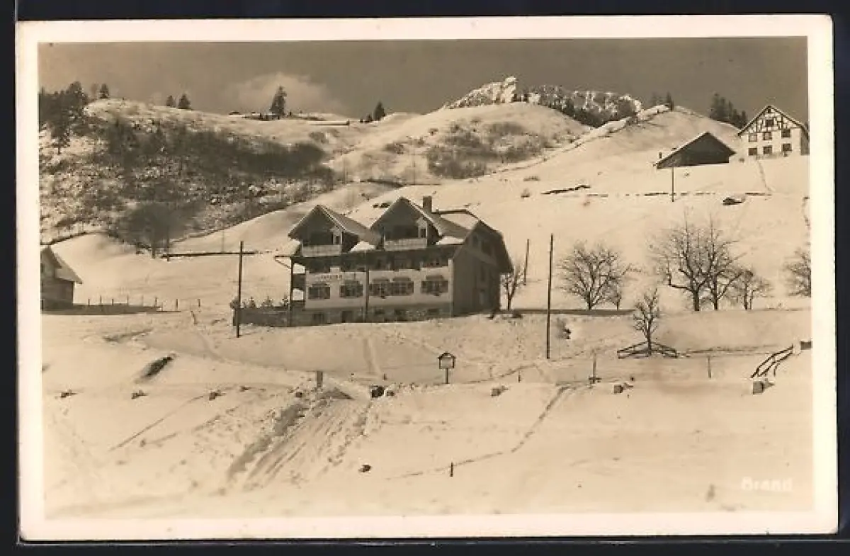 AK Brand /Vorarlberg, Winteransicht mit Alpenpension Nessler am schneebedeckten Hang