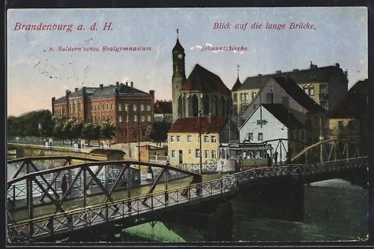 AK Brandenburg a. d. H., Lange Brücke mit Strassenbahn, Johanniskirche, v. Saldern`sches Realgymnasium